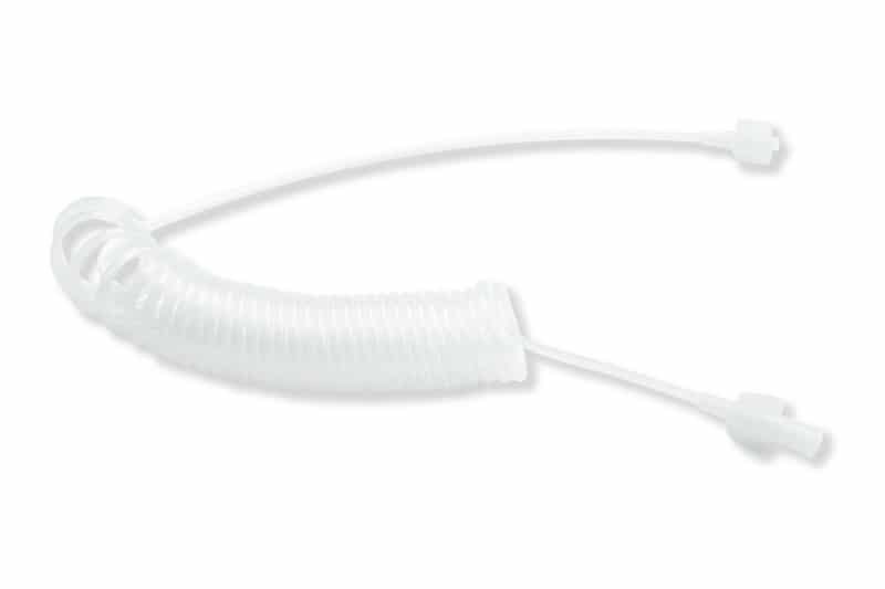 Spiralna linia przedłużająca z polietylenu do cewników dożylnych, z męskim złączem Luer-lock na końcówce dystalnej oraz żeńskim złączem Luer-lock na końcówce proksymalnej.