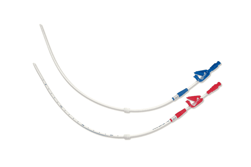 Poliuretanowy, widoczny w RTG dwuświatłowy cewnik do żyły centralnej 10 Fr x 52 cm z zintegrowanym skrzydełkiem mocującym oraz rurką przedłużającą z oznaczeniami co 5 cm, wprowadzany przy użyciu kaniuli Neocath Split