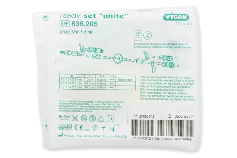 Linia główna (długość 20,5 cm) z 2 portami dostępu obejmującymi zawory bezzwrotne i zaciski. Ta linia jest również wyposażona w filtr 0,22µm działający 96 godzin z membraną niskiej adsorpcji białek. Ten filtr eliminujący powietrze nie jest przeznaczony do kontaktu z krwią, produktami krwiopochodnymi lub lipidami. Szybkość przepływu: 3,5 ml/min