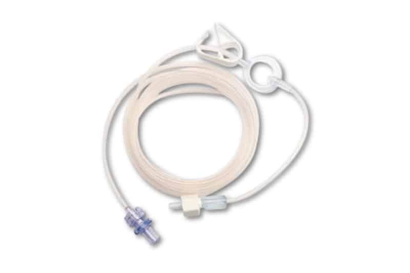 Zestaw przedłużający 150 cm z PCW z wyściółką z polietylenu, z filtrem 0,22 mikrona eliminującym powietrze i zatrzymującym endotoksyny, o czasie działania 96 godzin, oraz zaworem antyskażeniowym i etykietami identyfikacyjnymi