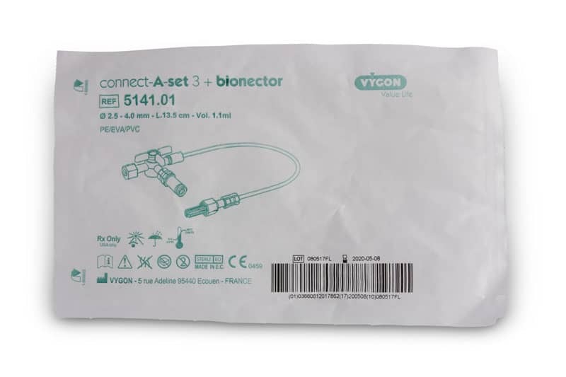 Linie przedłużające o kodach 5141.00, 5141.01 i 5141.10 są dostarczane z 1 złączem Bionector zamontowanym na bocznym porcie zaworu spustowego oraz prostym męskim obturatorem Luer-lock na drugim porcie zaworu spustowego.