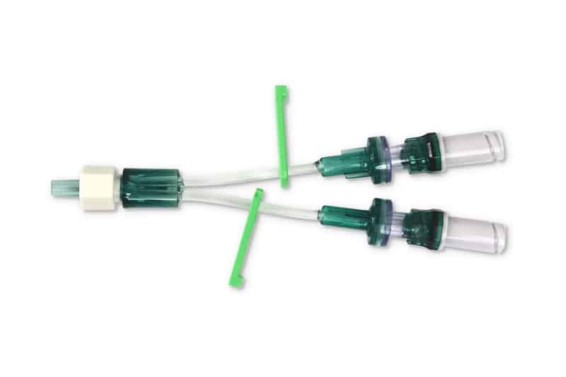 Kod 841.232: linia przedłużająca o podwójnym świetle z 2 zaworami bezzwrotnymi, 2 złączami Bionector i 2 zaciskami (zielonymi).